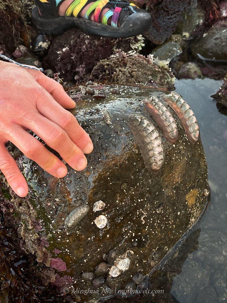 Under nearly every flipped rock were purple sea urchins. Their many spines offer protection and trap tiny—and sometimes not-so-tiny—rocks. Those spines also gave us pause before we picked them up. They sat still at first, then began to move in search of a new hiding place. Having our hands walked across by countless little spiny “feet” produced a funny feeling: mildly ticklish and slightly sticky. That sensation came from the suction-cup-tipped tube feet as the urchins moved while simultaneously shuttling food toward their central mouthpart, known as “Aristotle’s Lantern”.
