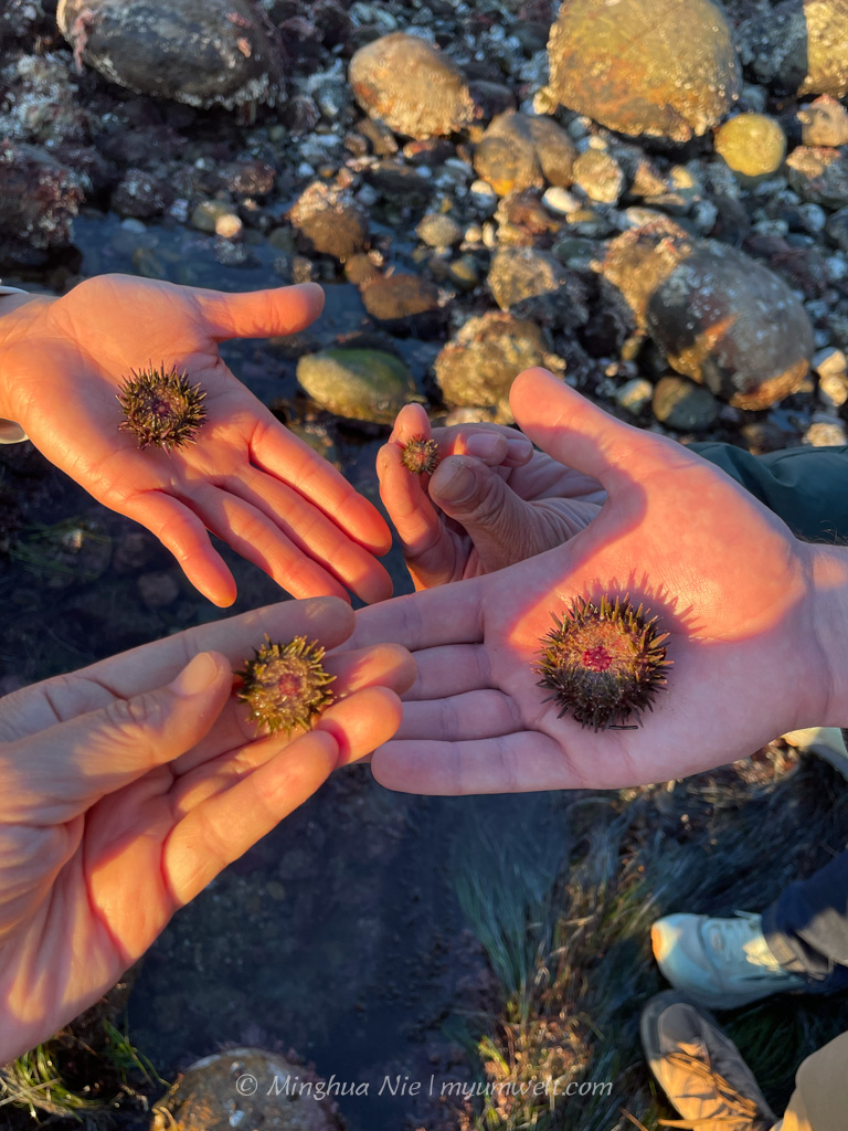 Although we didn’t need to worry about being consumed by these small herbivores, our broader interests are closely tied to them. The juvenile sea urchins we held in our palms had green spines—a youthful look they sport before turning a vivid purple as adults. Purple sea urchins feed on the holdfasts of giant kelp and can devastate kelp forests, which are vital to coastal ecosystems. After a photo or two, we returned those little spiny balls to their rocky homes. But was that the right thing to do? According to a KQED article, perhaps we should have thrown a sea urchin party to help save the kelp forests we love to explore on our ocean swims.