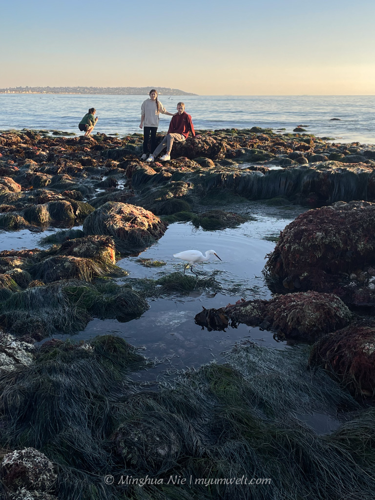 I was joined on this tidepool adventure by three friends. Our methodology was simple: move slowly toward the setting sun, taking turns carefully flipping a rock at each pool. Along the way, fellow observers helped spot a California two-spotted octopus in no hurry to conceal herself, a wiggly California sea hare, and an array of bat stars neatly arranged along the contours of a mossy rock. At one point, many tidepool-goers paused their search to admire the skill of a great egret. Probing with her stylish yellow foot, she bagged two or three tidepool fish (perhaps a sculpin or baby opaleye) in less than a minute.
